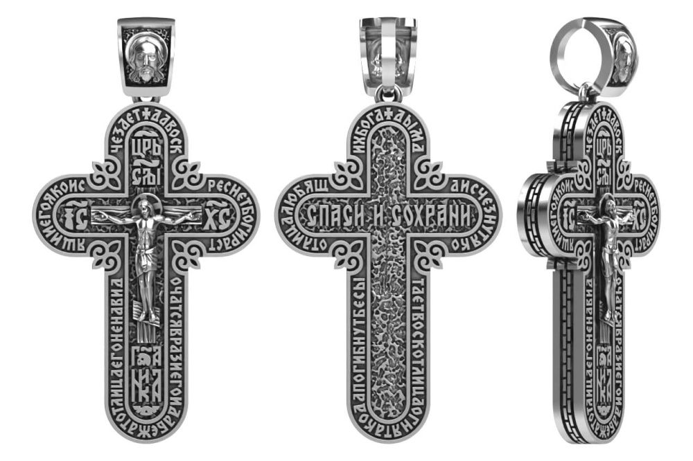 Лицевая сторона креста - молитва Животворящему Кресту, распятие. Тыльная сторона - молитва Животворящему Кресту, Спаси и сохрани.